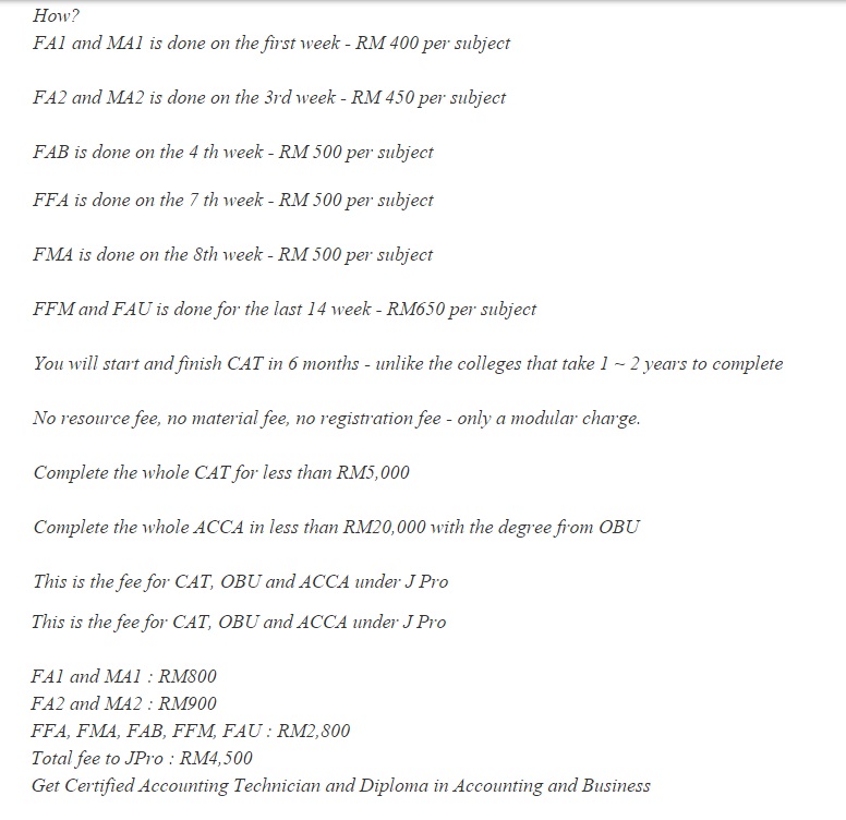 - Nope, I'm not going to stop until CAT. I'm going to take ACCA, but my plan is, after CAT, I have 2 options, either full-time ACCA, or part-time ACCA. It will depend on the situation later.